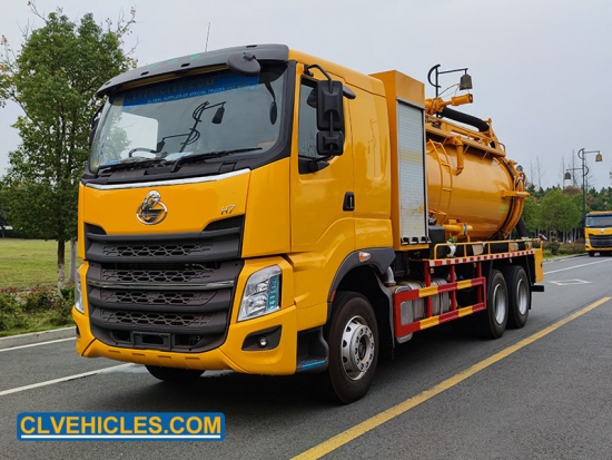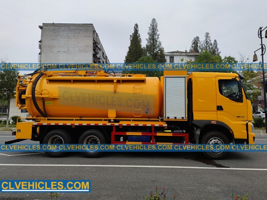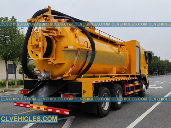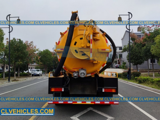 تجمع الشاحنة بين خزان صرف صحي من الفولاذ الكربوني بسعة 10000 لتر مع مضخة تفريغ SK-42 وخزان مياه بسعة 4000 لتر مزود بمضخة عالية الضغط بقوة 330 لترًا في الدقيقة للنفث والشفط بكفاءة.