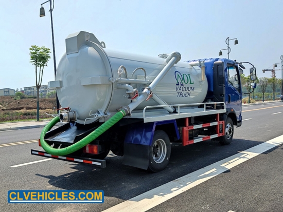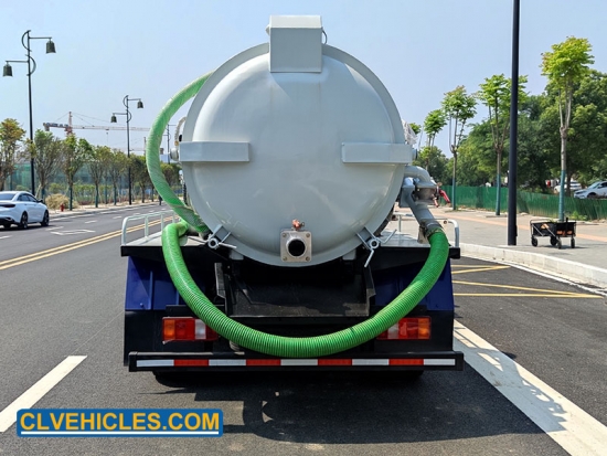 2. شاحنة الشفط مُجهزة بنافذة فحص مستوى، ومنفذ تدفق ذاتي، وجهاز غسل يدوي، وصمام مانع للتدفق، وأنبوب شفط بطول 8 أمتار، وفتحة هيدروليكية للباب الخلفي، ومضخة تفريغ مياه SK-15. تتميز شاحنة الشفط بقوة شفط عالية، بالإضافة إلى وظيفة رفع الخزان.